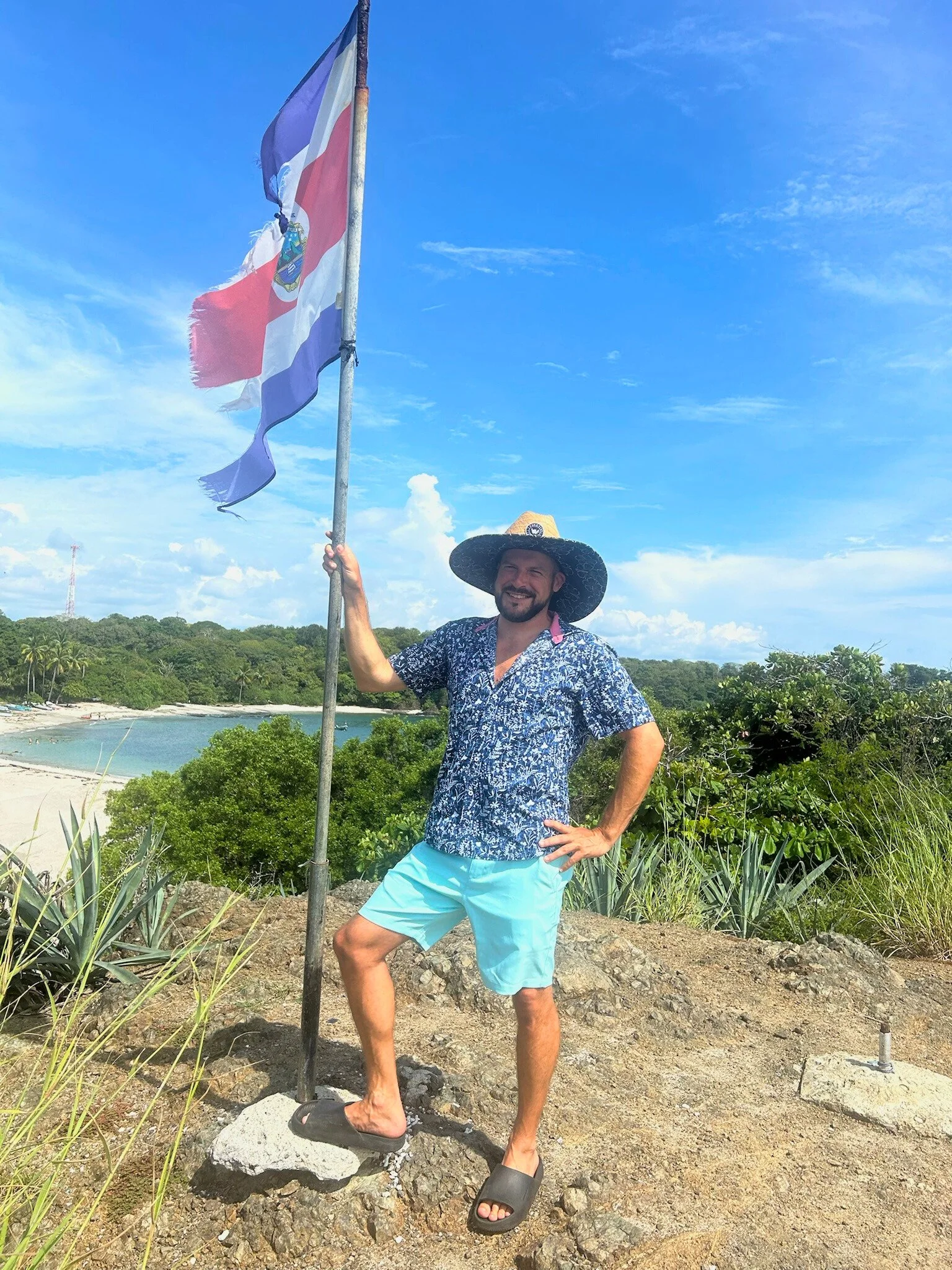 A man standing outdoors on a rocky area holding a flagpole with the Costa Rican flag, wearing a large straw hat, a patterned short-sleeve shirt, light blue shorts, and black slides, with a scenic background of a beach, ocean, green trees, and a blue sky with some clouds.