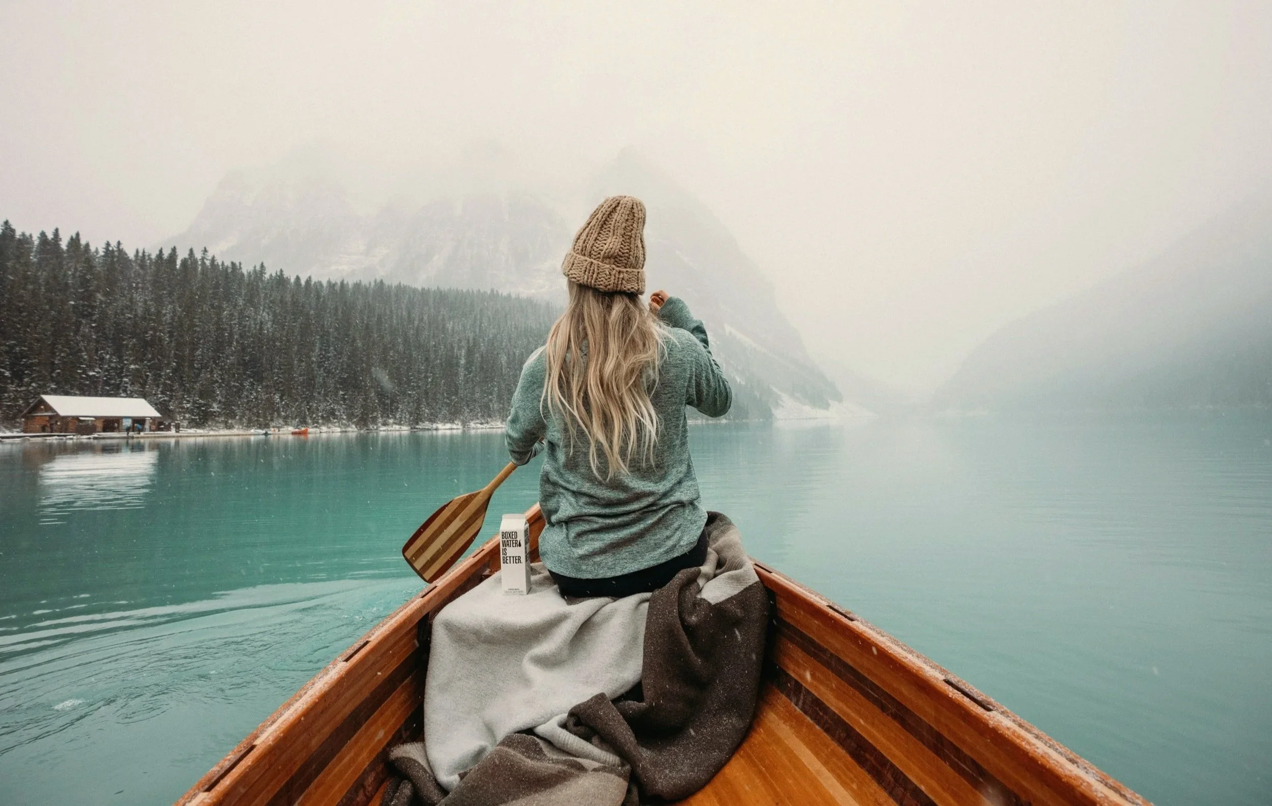 A woman sitting in a wooden boat on a calm, foggy lake surrounded by forested mountains, enjoying vacations
