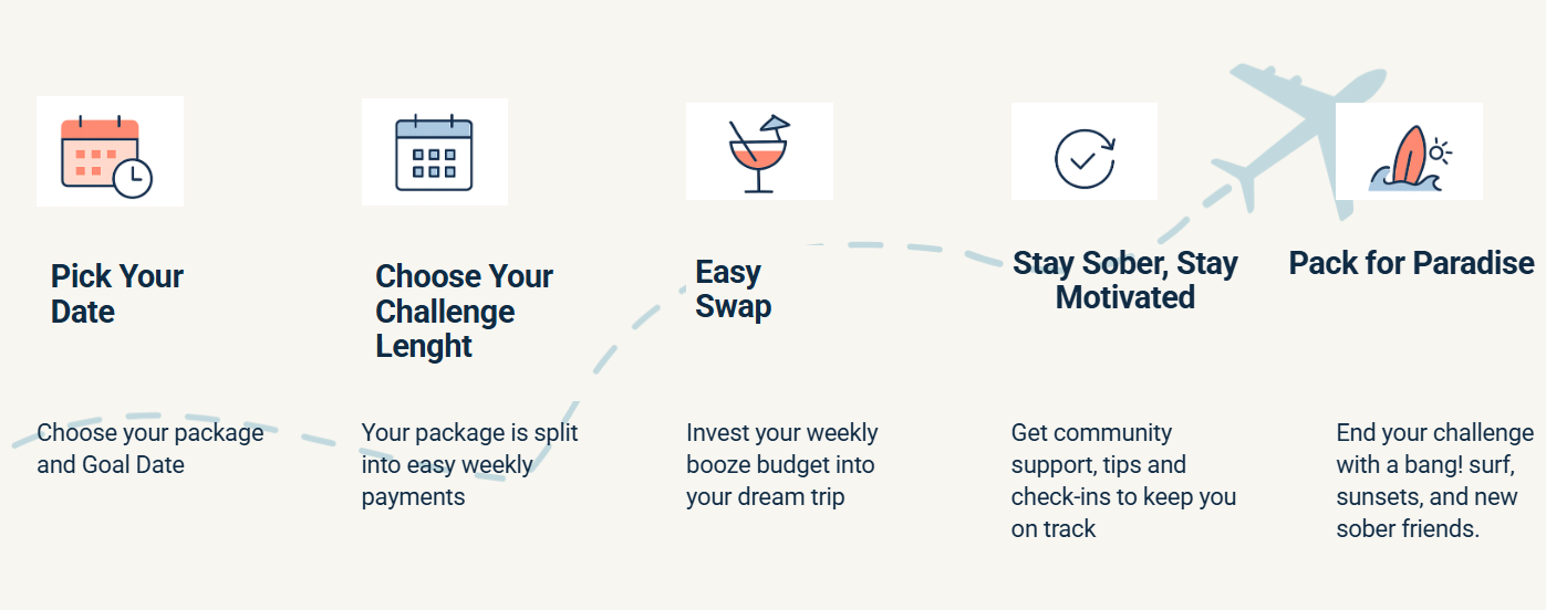 A five-step travel challenge plan with icons: a calendar, a document, a cocktail, a checkmark, and an airplane with surfboard. The steps include picking a date, choosing challenge length, easy swap, staying sober, and packing for paradise.