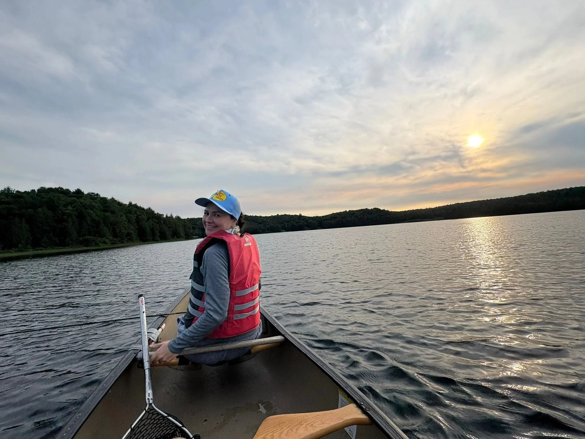 A person smiling and sitting in a canoe on a lake during sunset, with a forested shoreline and the setting sun reflected on the water in the background.